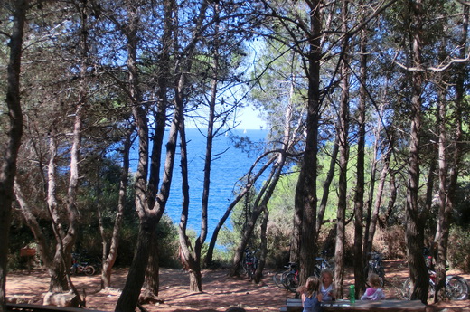 V pondělí jedeme na další vyhlášenou pláž - Malá Kolumbarica, která je proslulá svými jeskyněmi a útesy, z nichž lze skákat do hluboké vody. Nad touto pláží se nachází také Safari Bar, stylově umístěný v rákosí, všude přírodní posezení a spousta atrakcí pro děti (vše pouze na ruční pohon). Pláž Kolumbarica leží na nejjižnějším výběžku národního parku, tudíž tady celý den svítí slunce a není se kam schovat. Holkám se tady moc líbilo, hlavně kvůli plavbám do jeskyně.