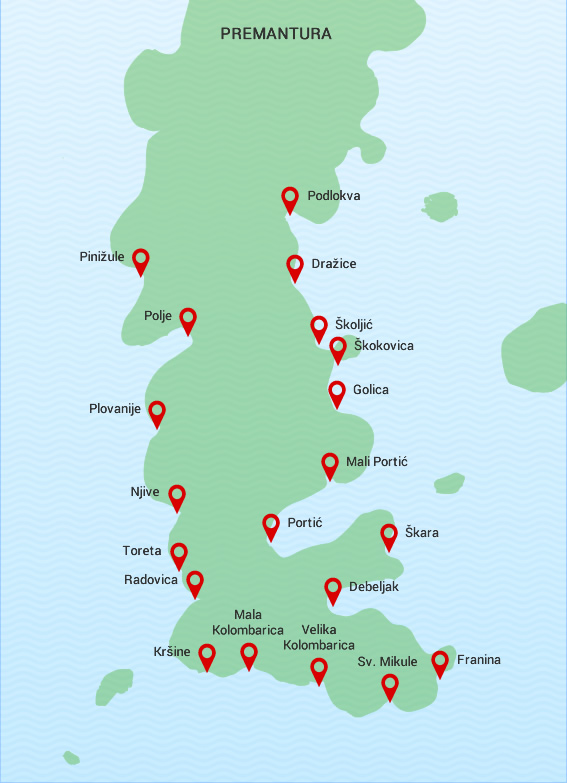 V některých zátokách najdete malá kotviště se starými rybářskými osadami (Polje, Podlokva), nová výstavba není povolena. Zejména jachtaři vyhledávají větší chráněnou zátoku Portić na východním pobřeží.